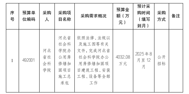 为便于供应商及时了解政府采购信息,根据《财政部关于开展政府采购意向公开工作的通知》(财库〔2020〕10号)等有关规定,现将河北省社会科学院2025年8月至12月采购意向公开如下: