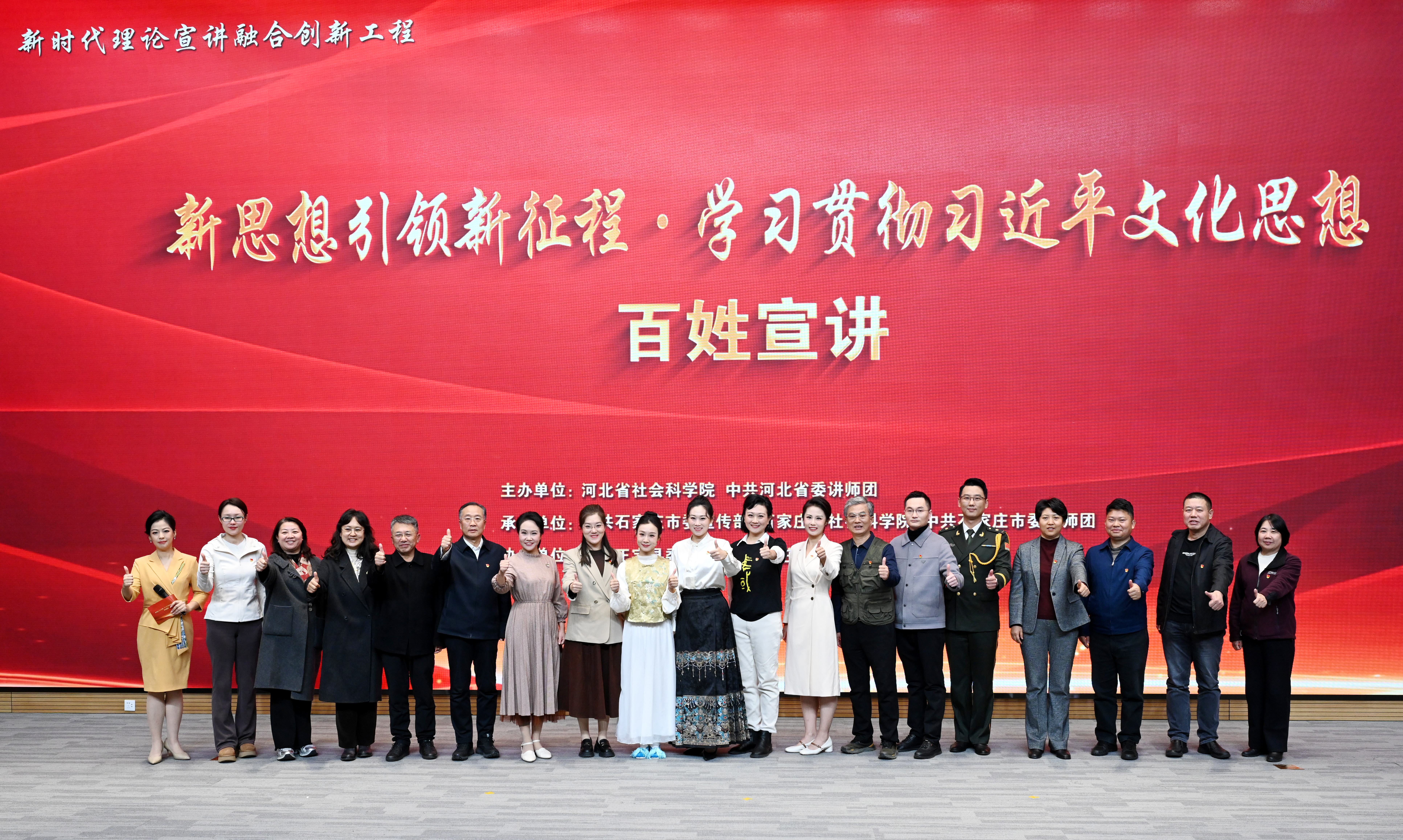 在习近平文化思想提出两周年之际,为继续深入学习贯彻习近平文化思想,推动党的创新理论“飞入寻常百姓家”,10月23日,“新思想引领新征程·学习贯彻习近平文化思想”百姓宣讲在石家庄图书馆(新馆)成功举办。本次活动由河北省社科院、省委讲师团主办,石家庄市委宣传部、石家庄市社科院、石家庄市委讲师团承办,正定县委宣传部、石家庄市图书馆协办。省社科院党组书记、院长,省委讲师团主任,省社科联第一副主席吕新斌,石家庄市委常委、宣传部长、市社科联主席郭建平分别致辞,省社科院党组成员、省委讲师团副主任兼省社科院副院长袁宝东出席活动。石家庄市、正定县各界代表与学生群众约350人共同聆听了宣讲。